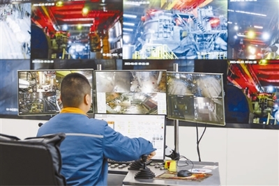 安全管控 江苏省南京市雨花台区,宝钢股份梅山钢铁行车操控中心内,工作人员在地面集控室进行远程操作。随着5G技术广泛应用,钢铁行业加快数字化转型升级,打造“5G+数字炼钢”应用场景,实现作业少人化、无人化,有效提升安全性。 冯 芃摄(人民视觉) |