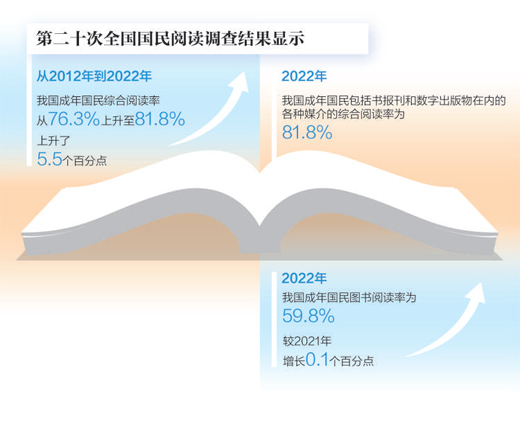 第二届全民阅读大会上,中国新闻出版研究院发布了第二十次全国国民阅读调查结果。数据显示,2022年我国成年国民包括书报刊和数字出版物在内的各种媒介的综合阅读率为81.8%,较2021年的81.6%提升了0.2个百分点。