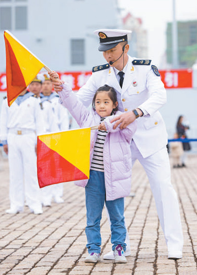 4月23日,山东青岛港,海军成立纪念日舰艇开放活动现场,小朋友在体验海军旗语文化。 |