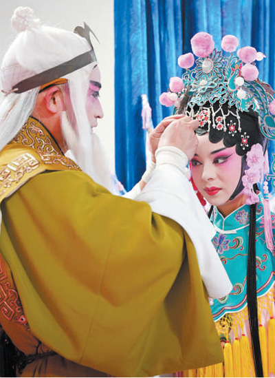 弋阳腔艺术保护中心的演员在后台准备演出。 |