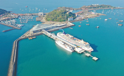 阿马多尔邮轮码头项目位于巴拿马运河太平洋入海口的佩里科岛,由中国港湾工程有限责任公司承建,中交二航局负责施工。目前,项目施工进入最后收尾阶段。码头建成后,可全天候容纳两艘长360米、各运载旅客5000人的船只靠泊,助力巴拿马旅游业发展。图为阿马多尔邮轮码头项目远景。