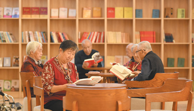 老人们在河北省沧州市中心医院医养中心阅览区阅读书籍。 |