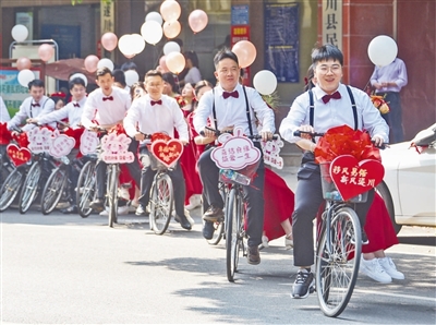 近日,江西省吉安市遂川县集体婚礼在该县龙泉公园同心广场举行。12对新人骑自行车沿街宣传移风易俗、新事新办,新人们牵手经过幸福长廊,集体宣读婚姻誓词,还有新人代表宣读移风易俗倡议书,现场喜庆欢快。这种既简朴又热烈的办喜事方式受到了当地群众的欢迎。图为新人们骑自行车沿街宣传婚礼新风。