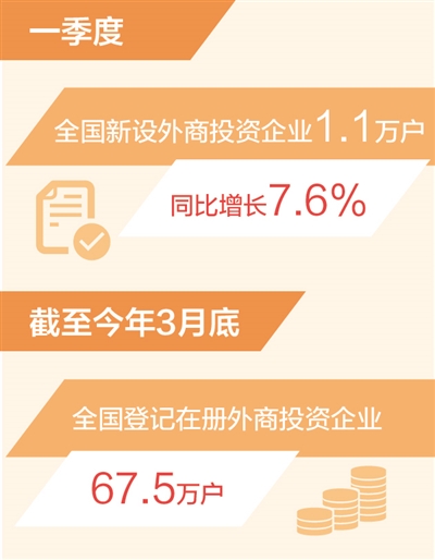 本报北京5月27日电 (记者林丽鹂)记者26日从国家市场监督管理总局获悉:一季度,全国新设外商投资企业1.1万户,同比增长7.6%;3月全国新设外商投资企业4818户,单月同比增长44.0%,企稳向好势头明显。