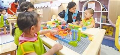 浙江省湖州市爱山街道根据辖区特色,将“一老一小”作为重点服务群体,建设15分钟便民生活圈,切实满足市民生活需求。图为5月29日,在爱山街道利民社区儿童之家,工作人员带着孩子玩积木。