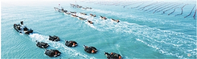 山东省荣成市爱伦湾海洋牧场,养殖工人驾驶渔船拖曳满载海带的舢板驶回码头。 |