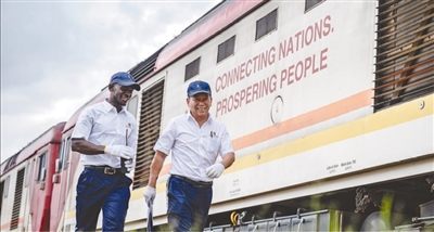 作为中国和肯尼亚共建“一带一路”的旗舰项目,由中国企业承建的蒙内铁路2017年5月31日建成通车。6年来,蒙内铁路宛如“大动脉”,加快了肯尼亚的现代化步伐,为东非地区互联互通和中非合作共赢留下浓墨重彩的一笔,给非洲人民带来实实在在的好处。图为5月23日,在肯尼亚内罗毕,中国“师父”蒋立平(右)与学员霍勒斯从一辆印有“连接国家 走向繁荣”标语的蒙内铁路机车旁走过。