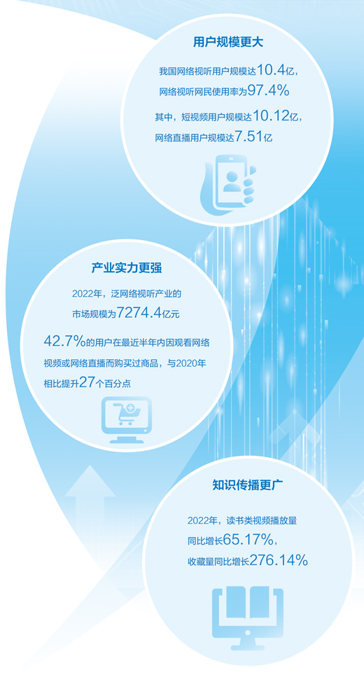 《报告》显示,2022年,泛网络视听产业的市场规模为7274.4亿元,较2021年增长4.4%;有42.7%的用户在最近半年内因观看网络视频或网络直播而购买过商品,与2020年相比提升27个百分点。以“视听+”为代表的新场景、新业态在社会生活和产业结构中的连接赋能作用日益凸显。