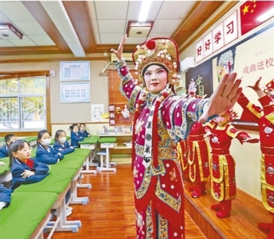 近日,河南省郑州市二七区淮河东路小学举办戏曲进校园活动,在戏曲名家的指导下,孩子们学习戏曲演唱、台步,近距离领略戏曲艺术的魅力。该学校还开设了传统文化类、学科拓展类等30多个社团,进一步丰富美育教学。