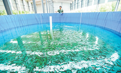 近年来,江西省新干县大力推进特色渔业发展,带动农民增收,助力乡村振兴。图为在新干县金川镇一处养殖基地内,工作人员给鱼投食。