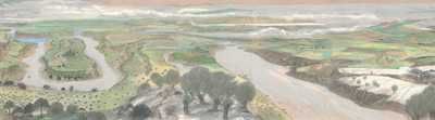 河北塞罕坝林场,是“三北”工程建设的重要区域。荒原变林海的塞罕坝奇迹,成为近年来主题性美术创作的重要课题。入选“筑梦——我们的新时代美术摄影作品展”的谭智群油画《美丽的塞罕坝》,是在实地写生基础上的艺术提炼和情感升华。作者以俯视的构图,铺展满目苍翠的美景。画面左侧,清澈的河流蜿蜒向前;画面右侧,白色的雁群逐绿翱翔;远方,茂密的森林不断延伸,风力发电机林立于山巅,画面充满生机与活力。同样以俯视的角度处理构图,孔亮油画《美丽中国——塞罕坝》则以塞罕坝林场和塞罕塔为视觉中心,葱茏的绿意,将意境渲染得更加深邃。翁凯旋油画《沧海桑田——塞罕坝的前世今生》,通过三联画的形式,在新旧对比中构建时空长廊,描绘出塞罕坝的时代变迁。