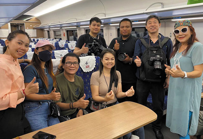 中老两国记者在中老铁路跨境客运列车上采访时合影。 |