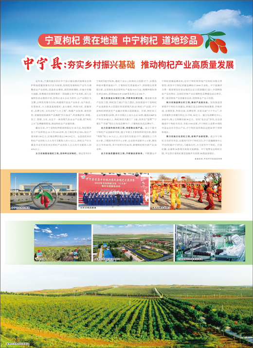 近年来,宁夏回族自治区中宁县以建设黄河流域生态保护和高质量发展先行区为统领,坚持把发展枸杞产业作为调整农业产业结构,促进农业增效、农民持续增收,实施乡村振兴战略、统筹城乡协调发展的一项战略主导产业来抓,深入实施特色农业提质计划,坚持以龙头企业为依托、以产业园区为支撑、以特色发展为目标,构建现代农业产业体系、生产体系、经营体系,大力推进基地稳杞、龙头强杞、科技兴杞、质量保杞、品牌立杞、文化活杞“六大工程”,构建产业标准、绿色防控、质量检验检测和产品溯源“四大体系”,形成集研发、种植、加工、营销、文化、生态于一体的现代农业全产业链,把“枸杞之乡”品牌擦得更亮,推进枸杞全产业链发展。