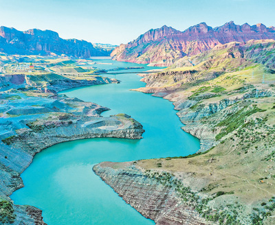 图为生态修复后的呼图壁县南部山区河流碧波荡漾,与丹霞地貌相映成景。