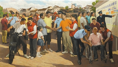 油画《基层治理的样本——枫桥经验》,作者陆琦、靳庆金、方经纬、金丹。 |