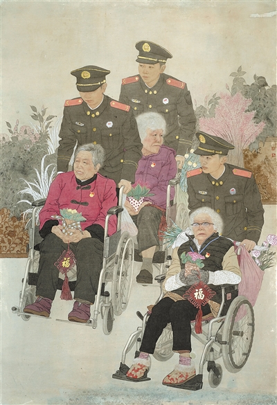 中国画《峥嵘岁月——不老女兵》,作者夏令兵。 |