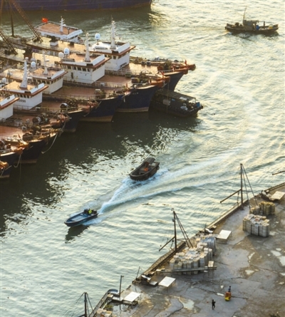 广西北海银海区电建渔港,搭载回港休渔船只人员和货物的小船返回码头。 李君光摄(新华社发)
