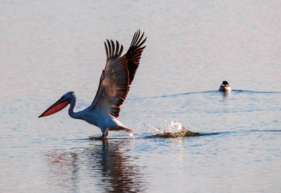 江苏东台条子泥湿地,卷羽鹈鹕展翅飞翔。 |