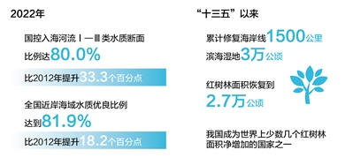 新时代十年来,我国大力推动海洋生态环境保护,渤海综合治理攻坚战阶段性目标任务圆满完成,陆海统筹的近岸海域污染防治持续推进,“蓝色海湾”整治行动、海岸带保护修复工程等深入实施,海洋生态环境质量总体呈稳中向好趋势,局部海域生态系统服务功能明显提升。