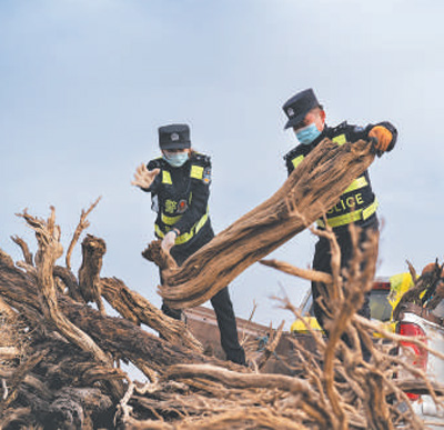 徐乃超、李文娜进行义务劳动,帮助群众捡拾过冬取暖柴火。 |