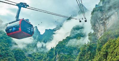 7月22日,雨后的湖南省张家界天门山景区,缆车在云海中穿行。