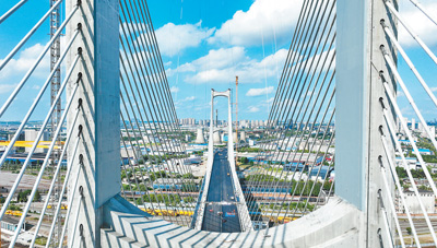 近日,湖北省襄阳北编组站大桥桥面沥青摊铺全部完工,为大桥如期建成通车夯实基础。