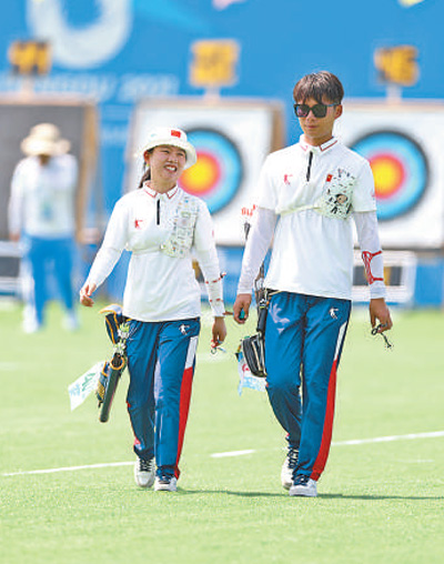 7月29日,中国大学生体育代表团选手冯浩(男)、王黎敏(女)在成都大运会射箭反曲弓混合团体比赛中。 |
