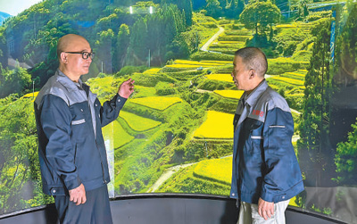白建荣(左)在讲解光纤光波导沉浸式内圆柱面显示大屏工作原理。 |