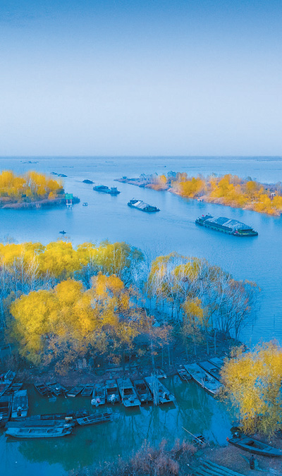 山东省济宁市,京杭大运河的运输船只穿过微山湖。 |
