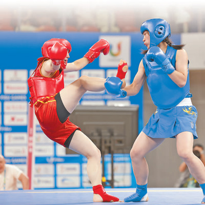 3日,中国代表团选手李志勤(右)在武术散打女子60公斤级决赛中。 |