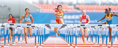 3日,中国代表团选手吴艳妮(中)在田径女子100米栏比赛中。 |