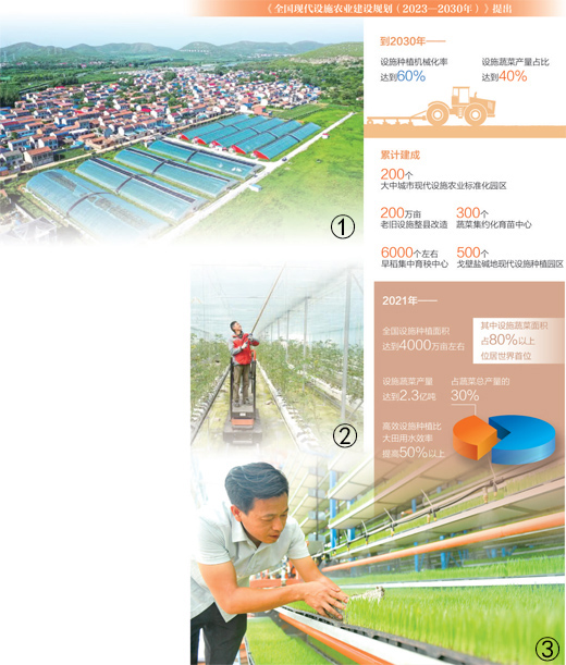 推进现代设施种植高质量发展,要以统筹强化粮食与“菜篮子”产品稳定安全供给为目标,稳定蔬菜产能、提高生产效能、调优生产结构。根据规划,到2030年,全国将累计建成200个大中城市现代设施农业标准化园区、200万亩老旧设施整县改造、6000个左右早稻集中育秧中心、300个蔬菜集约化育苗中心。设施蔬菜产量占蔬菜总产量的比重达到40%,设施种植机械化率达到60%,保供能力、质量效益明显提高。