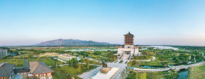 山东省泰安市徂汶景区党工委坚持党建引领,立足山水资源和历史文化资源优势,深挖徂徕山红色文化,构建多点支撑、全域共享的文旅发展新格局,逐步走出一条生态优先、产业驱动、绿色低碳的高质量发展之路。图为汶河国家湿地公园望岳楼风光。