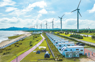 图为8月7日,荣成市港西镇海边风电场旁的房车营地。
