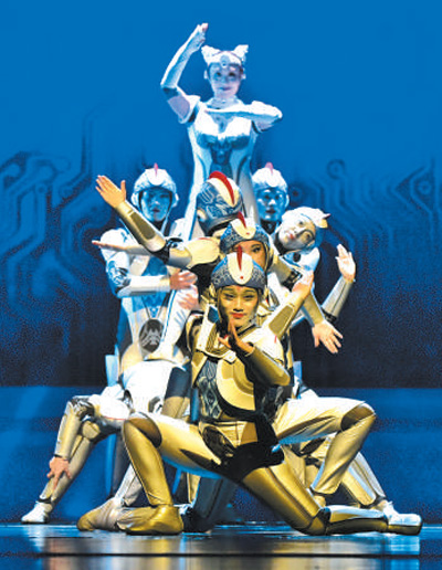 庐剧《逐梦》充分运用中国戏曲的写意性和假定性表现手法,完成舞台上现实空间、心理空间和互联网空间的切换、叠加、交错和闪回,形成崭新的舞台呈现样式。在唱腔、念白、动作等方面保留传统庐剧的特色,使演员本身的唱功和形体能力得到淋漓尽致的发挥。该剧又将充满科技感的元素自然地融入其间,将现代舞、机械舞等形式同戏曲表演技巧进行别具匠心的“融合”,特别是将符号化的智能机器人群舞场面贯穿全剧。在剧中,充分显示科技题材特性的机器人,时而发挥道具的功能,时而作为环境的点缀,时而用作气氛的营造,时而成为剧作的人物,运用得较为妥当。