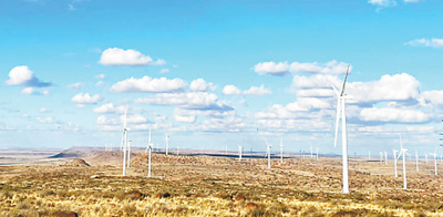 中国国家能源集团龙源南非公司承建并运营的德阿风电项目,是南非已投产的规模最大的风电项目之一。项目总装机容量24.45万千瓦,每年向南非电网输送约7.6亿千瓦时清洁电力。图为德阿风电项目。