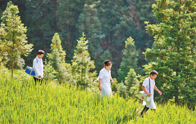 8月16日,在贵州黔东南苗族侗族自治州榕江县忠诚镇,村医吴昌喜(左)和儿子吴涛(右)、儿媳项昌会走在郊外的田埂上。他们呵护着三个村820多户3660多名群众的健康。 |