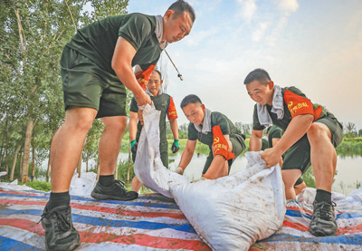 日前,武警天津总队机动支队在大清河天津段加固堤坝。8月18日7时,大清河洪水红色预警降级为橙色预警。当地进一步落实主体责任,组织力量继续做好风险隐患排查。 胡东润摄(人民视觉)