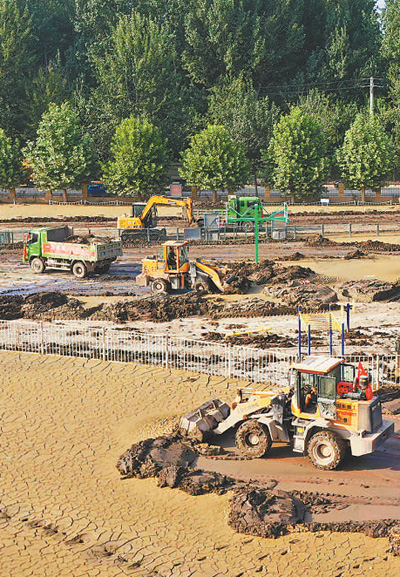 8月19日,河北省涿州市体育中心,多台机械车辆在清理淤泥。 熊华明摄(人民视觉)