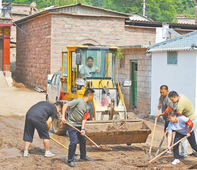 8月15日,河北省邢台市信都区郑家庄村,党员志愿者帮群众清理道路。 邵玉姿 赵永辉摄影报道