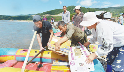 8月19日,在黑龙江省海林市长汀镇柞源屯,村民用充气橡皮艇运送保障物资。 张春祥摄(人民视觉)