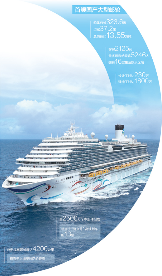 大型邮轮被誉为船舶工业皇冠上的“明珠”,是现代工业和现代化城市建设综合化、集约化的巨系统工程,直接反映了一个国家的综合科技水平与制造实力。国产大型邮轮的到来,意味着中国成为继德国、法国等国家之后,第六个能够建造大型邮轮的国家。