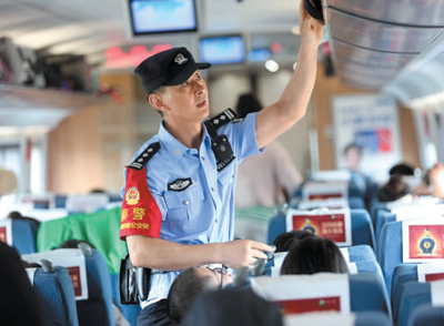 徐州铁路公安处乘警在检查列车安全。 |