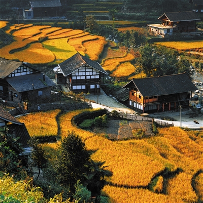 依山就势而造的梯田,小如碟、大如盆、长如带、弯如月,形态各异,变化万千。春来,水满田畴,面面银镜山间挂,五彩斑斓;夏至,佳禾吐翠,排排绿浪从天泻;金秋,遍地澄黄,辉煌灿烂;隆冬,漫山瑞雪银装素裹,分外妖娆。梯田景观随四季变迁,赋予紫鹊界如诗如画的自然风光。