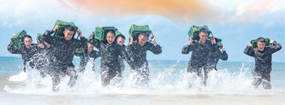 武警广西总队防城港支队官兵在海水中进行负重冲刺训练。 |