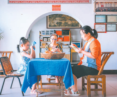 刘寿仙及女儿、外孙女正在做绣活。 |