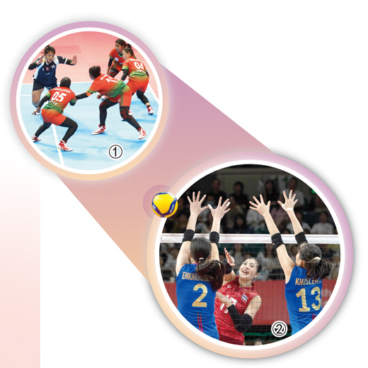 图②:10月2日,女子排球预赛B组最后一场比赛,泰国体育代表团选手(中)与蒙古国体育代表团选手在比赛中。