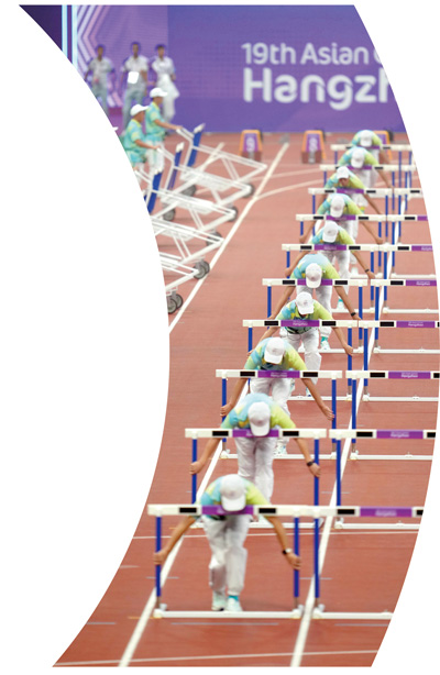 杭州奥体中心体育场内,志愿者在田径项目女子七项全能100米栏比赛前准备场地。 |