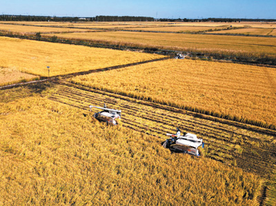 辽宁省沈阳市沈北新区兴隆台街道的稻田里一派丰收景象,收割机正在抢收水稻。