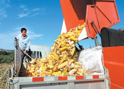 河南省辉县市洪州乡,农民正在装运刚收获的玉米棒。